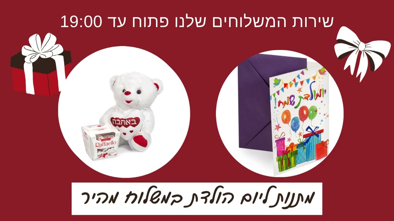 מחפשים משלוח מתנות במשלוח מהיר באבן יהודה? סלסלות מתוקים בחיפה, מתנות ליום הולדת, סלסלת מתוקים, מארזי שוקולד וסלסלות שי בד"ץ במשלוח לחיפה. משלוחי מתנות באון ליין. סלסלת ממתקים וזרי שוקולד ליום הולדת ומתנות ליולדת. ניתן לשלוח לבית החולים הלל יפה מהיום להיום שירות המשלוחים שלנו פתוח עד 19:00.